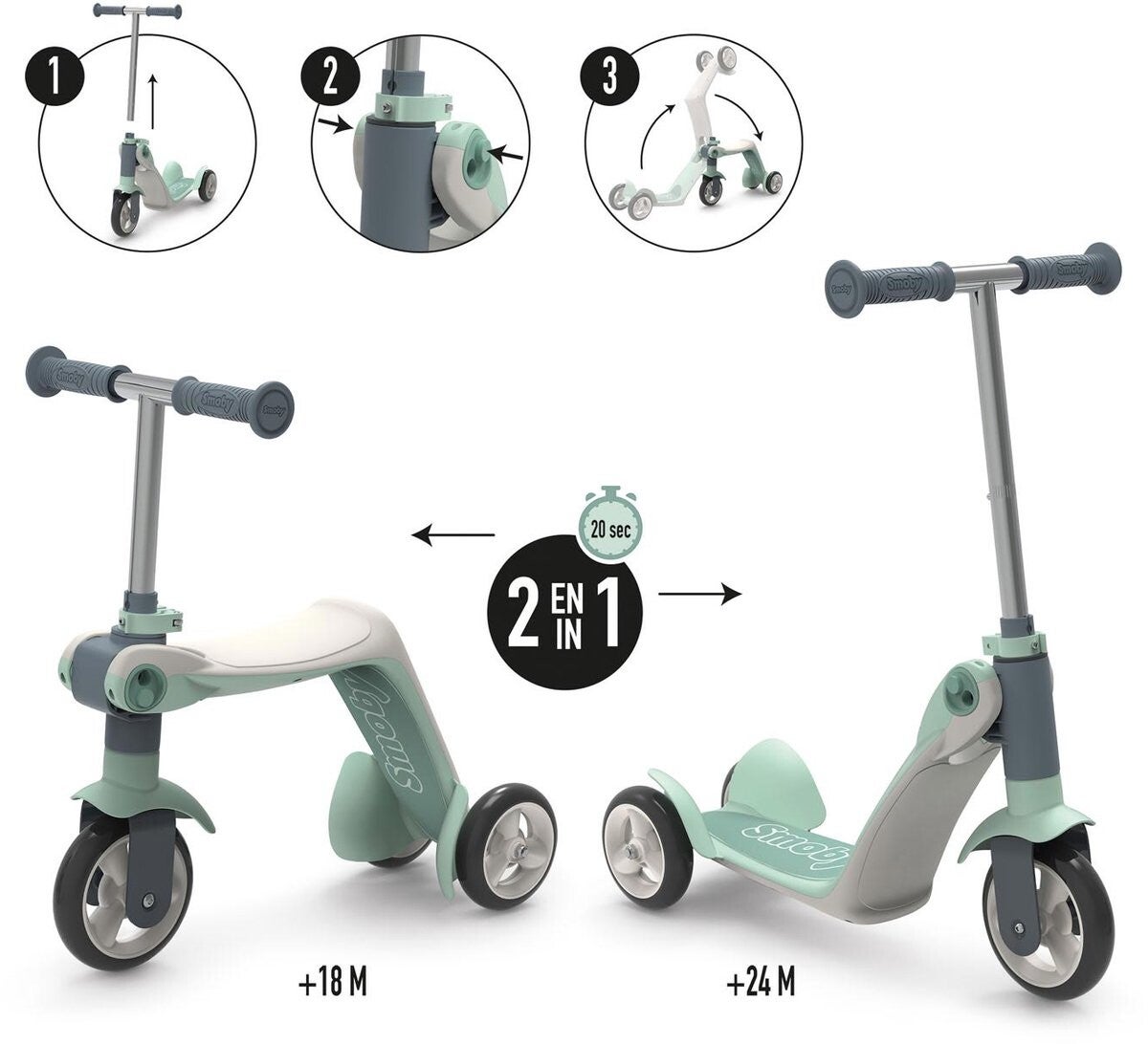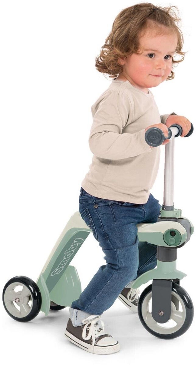 Een step en driewieler in 1! Smoby heeft het mogelijk gemaakt door de step te ontwikkelen met een omkeerbaar sta-/zitplankje. Draai de hoek naar boven en je hebt een driewieler, draai hem naar beneden en je hebt een step met 3 wielen.